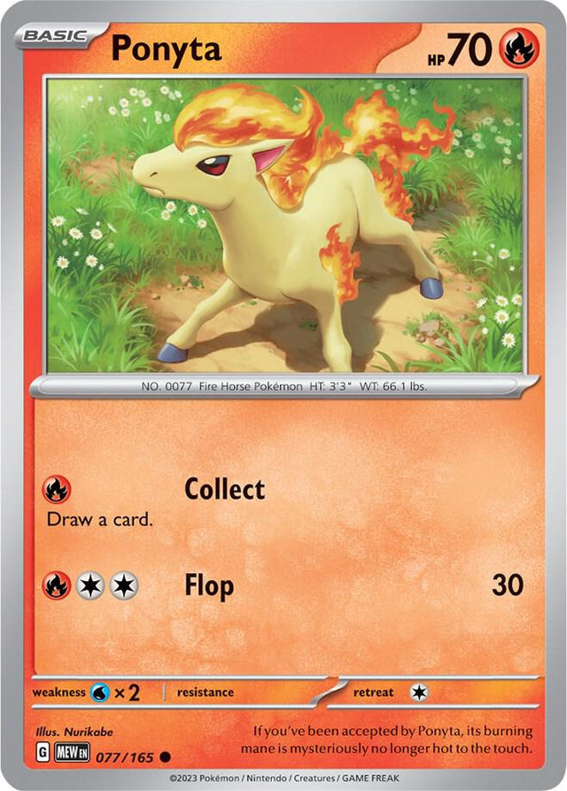 Explore the Ponyta from the 151 set in the Scarlet & Violet series! This Basic Fire Pokemon card features a Normal finish, and is classified as a Common. A must-have for collectors and players alike! The card number in this set is 077/165.
