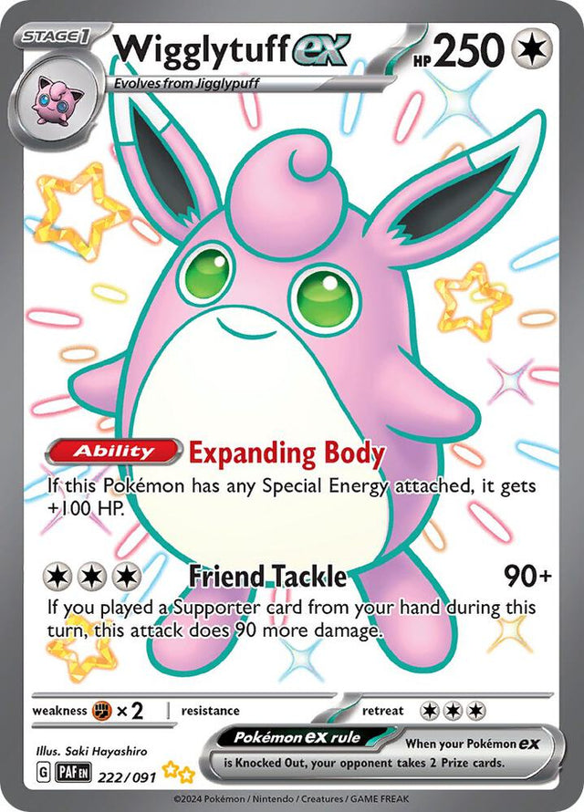 Explore the Wigglytuff ex from the Paldean Fates set in the Scarlet & Violet series! This Stage 1 Colorless Pokemon card features a Holofoil finish, and is classified as a Shiny Ultra Rare. A must-have for collectors and players alike! The card number in this set is 222/091.