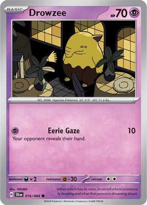 Explore the Drowzee from the Shrouded Fable set in the Scarlet & Violet series! This Basic Psychic Pokemon card features a Normal finish, and is classified as a Common. A must-have for collectors and players alike! The card number in this set is 016/064.