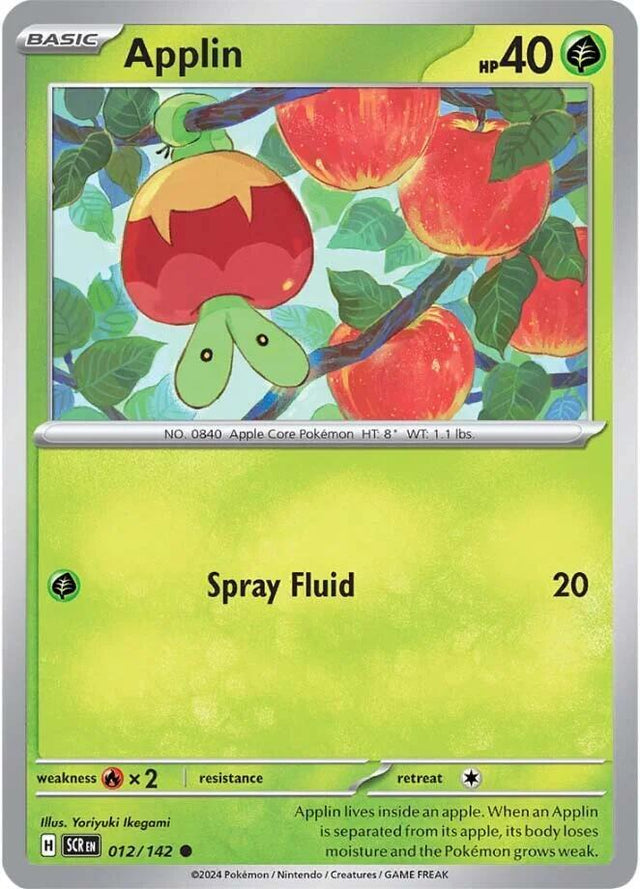 Explore the Applin from the Stellar Crown set in the Scarlet & Violet series! This Basic Grass Pokemon card features a Reverse Holofoil finish, and is classified as a Common. A must-have for collectors and players alike! The card number in this set is 012/142.